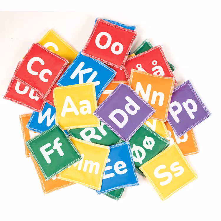 31 st färgglada ärtpåsar med tryckta bokstäver som erbjuder många möjligheter för lek och lärande.