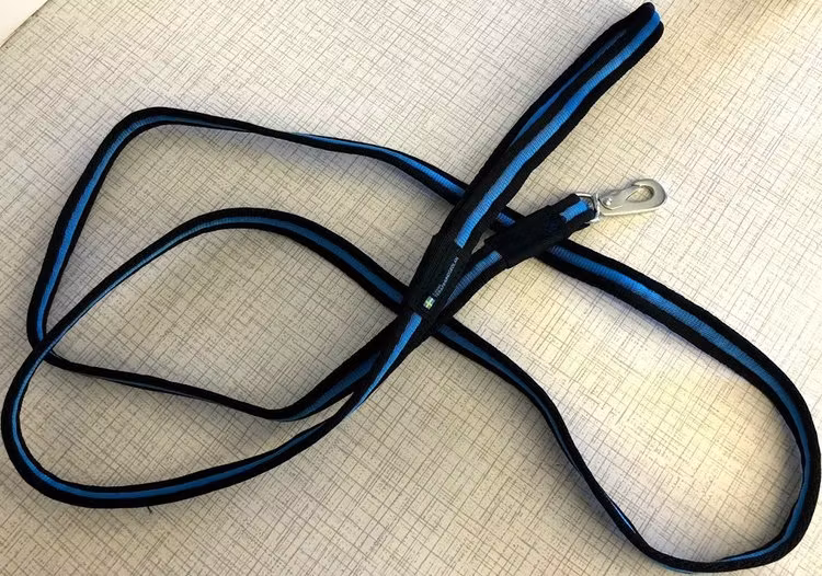 Koppel med Svenska Terapihundskolans egna färger, svart med turkost band.