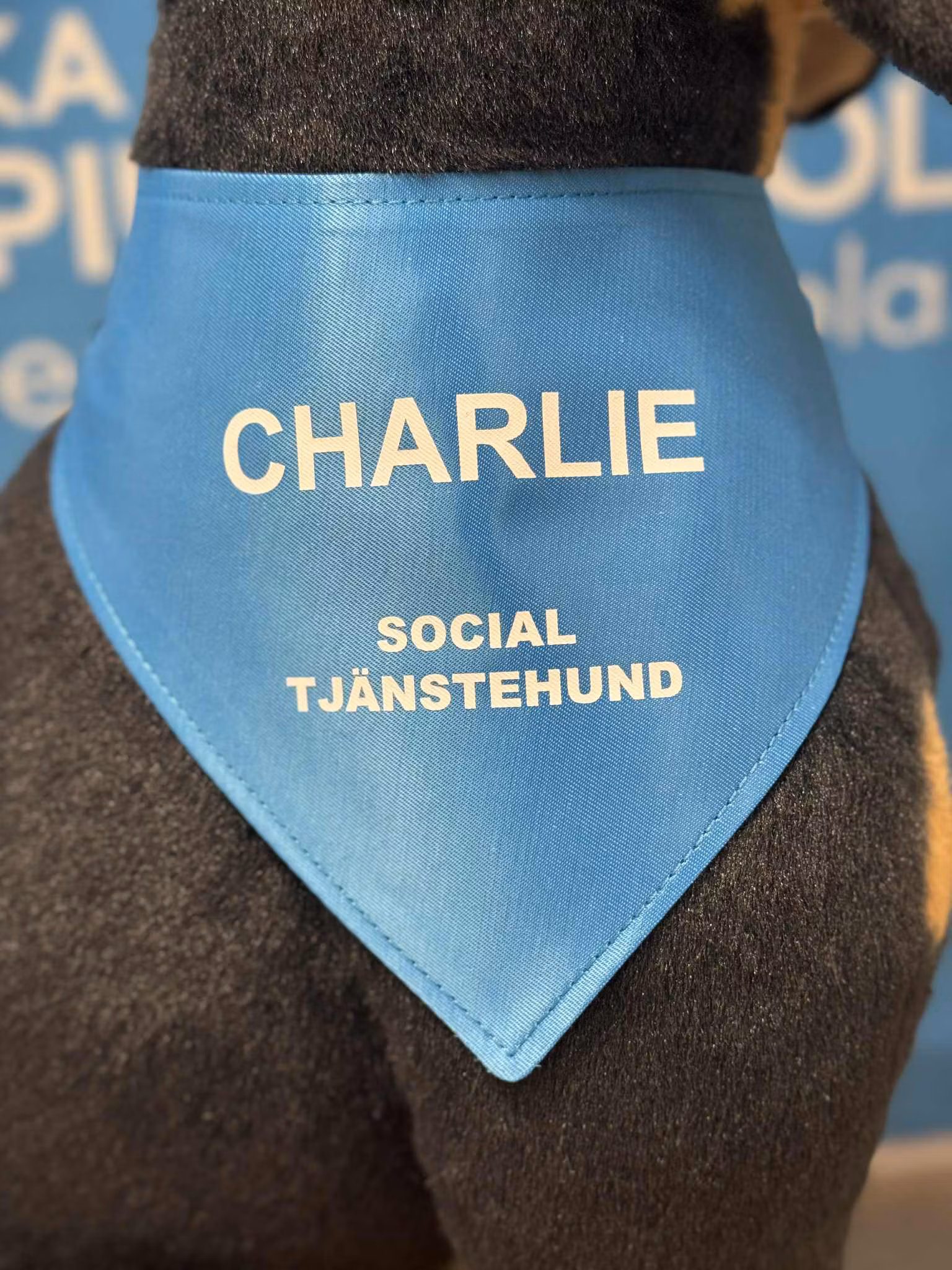 Snyggt tjänstetecken i Svenska Terapihundskolans färger.